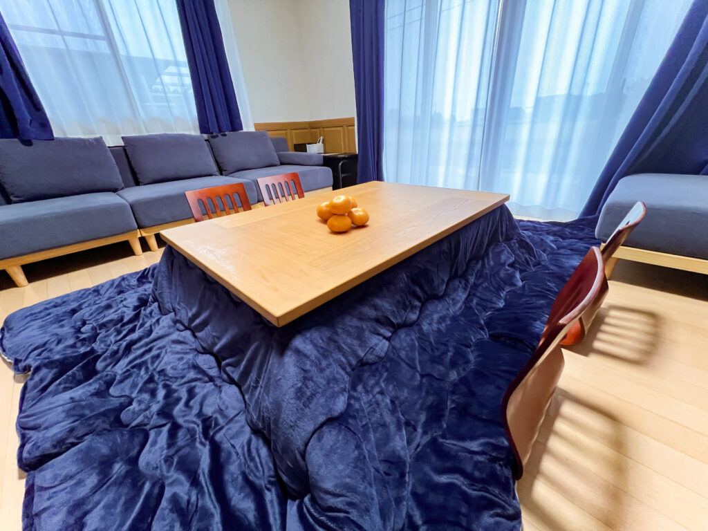 洋リビングの掘りごたつには、冬仕様の こたつ布団 を新しくセットしました。